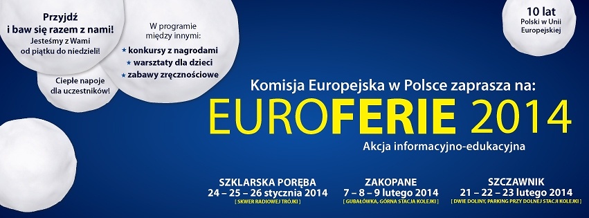 Po raz drugi Przedstawicielstwo Komisji Europejskiej w Polsce łączy edukację z zimową zabawą. Cykl imprez EUROFERIE 2014 to okazja, aby już na początku roku dowiedzieć się, co nowego oferuje Unia Europejska w nadchodzących miesiącach. Będzie mowa o zagadnieniach związanych z Europejskim Rokiem Obywateli, walce z kryzysem, o majowych wyborach do Parlamentu Europejskiego. Uczniom i studentom prowadzący opowiedzą o nowym programie UE na rzecz kształcenia, szkolenia, młodzieży i sportu Erasmus+. Wszystko to w atmosferze dobrej zabawy. Dla lubiących rywalizację nie zabraknie quizów z nagrodami, a dla spragnionych – gorącej herbaty, kawy i czekolad. Kolejna z tego cyklu akcja odbędzie się w Zakopanem od piątku do niedzieli.